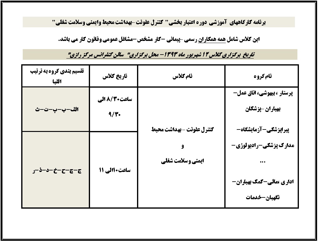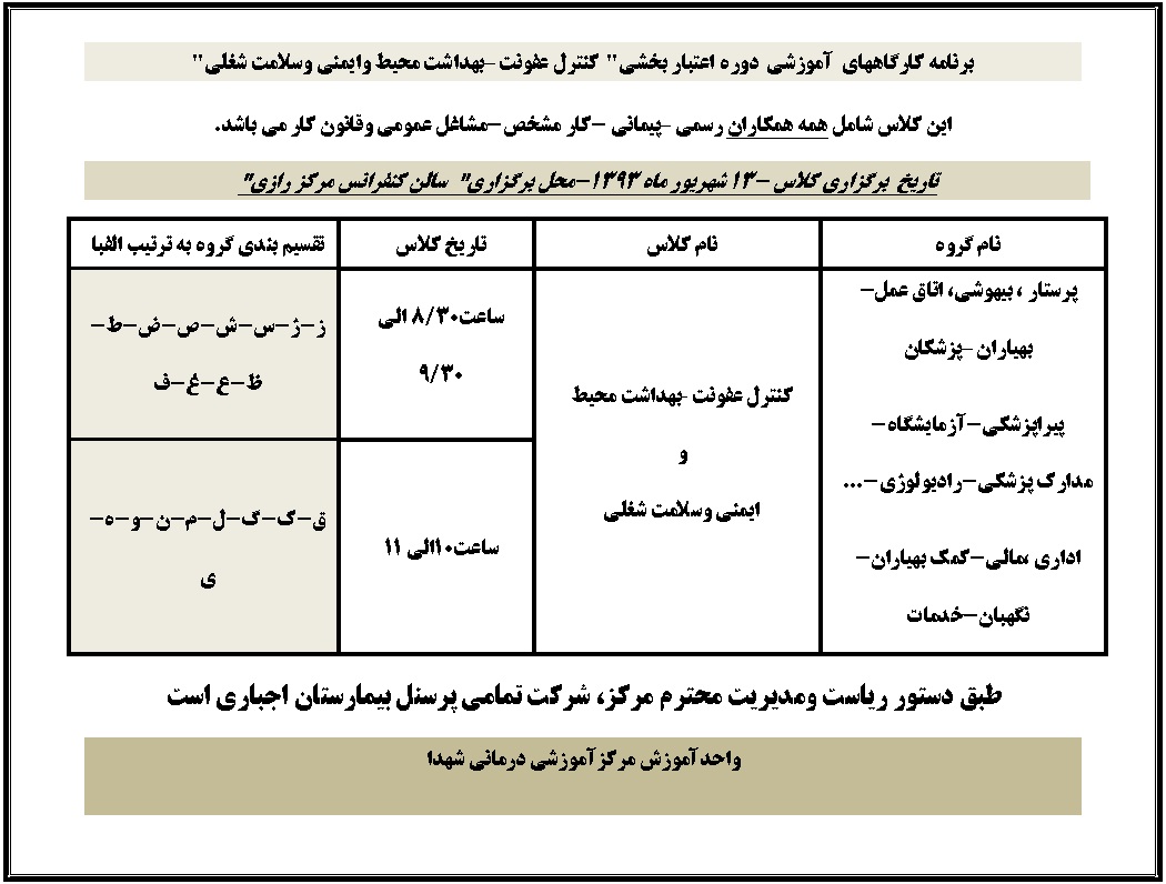 برنامه كارگاههاي آموزشي دوره اعتبار بخشي" كنترل عفونت –بهداشت محيط وايمني وسلامت شغلي