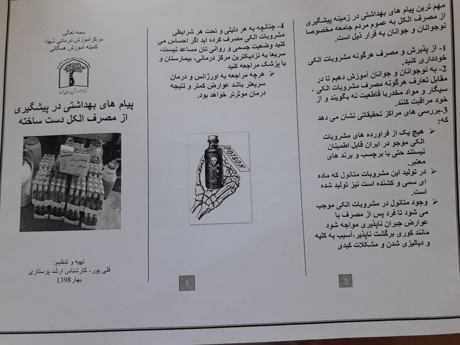 د) تهیه پمفلت آموزشی درمورد پیام های بهداشتی برای خانواده ها درمورد الکل تقلبی