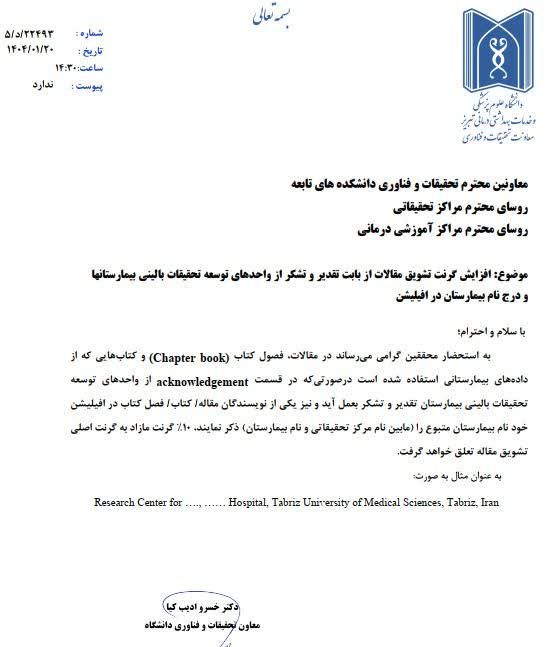 عطف به نامه شماره 22493/د/5-1404/01/20، در مقالات، فصول کتاب(Chapter book) و کتابهایی که از دادههای بیمارستان استفاده شده است، در صورتی که در قسمت Acknowledgement از واحدهای توسعه تحقیقات بالینی بیمارستان تقدیر و تشکر به عمل آید و نیز یکی از نویسندگان مقاله/کتاب/فصل کتاب در افیلیشن خود نام بیمارستان متبوع را (مابین نام مرکز تحقیقاتی و نام بیمارستان) ذکر نمایند، 10% گرنت مازاد به گرنت اصلی تشویق مقاله از طرف معاونت تحقیقات دانشگاه عوم پزشکی تبریز تعلیق خواهد گرفت.